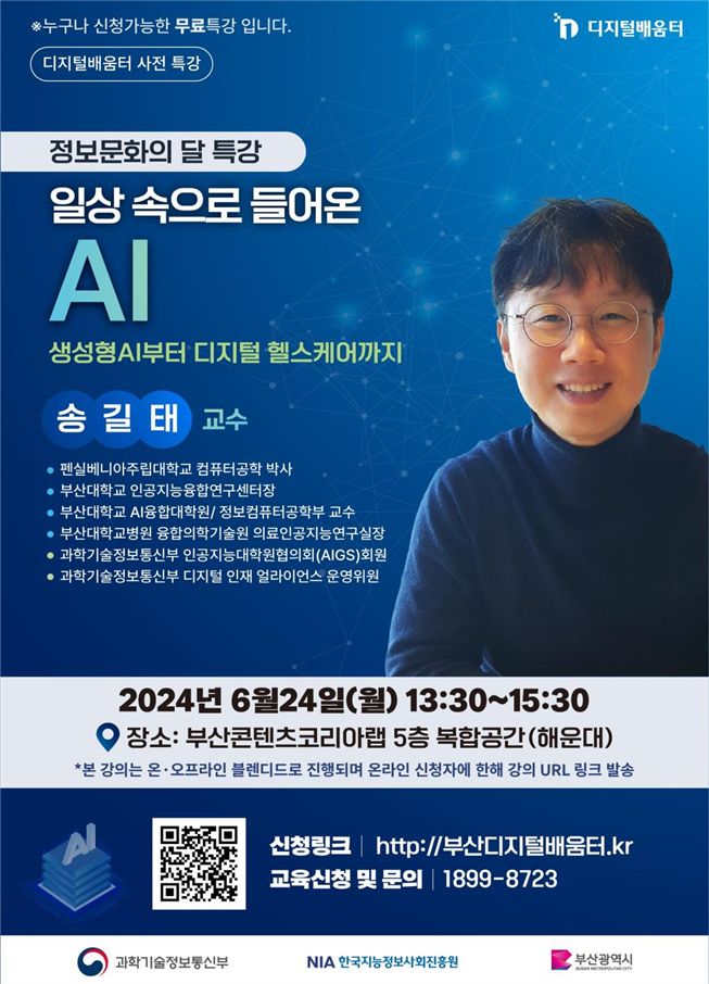 부산에서는 오는 24일 부산콘텐츠코리아랩에서 ‘일상 속으로 들어온 인공지능(AI)’이라는 주제로 생성형 인공지능(AI)과 디지털 헬스케어 관련 내용으로 부산대 인공지능융합연구센터장 송길태 교수가 강의한다.
