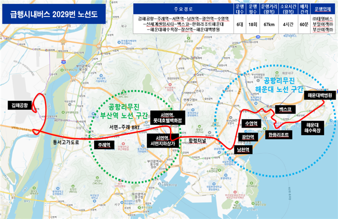 이번에 신설한 도심고속형 대체노선은 기존 공항리무진 해운대노선(정류소 16개)에 부산역노선 일부(정류소 3개)가 추가됐으며, 김해공항(서부산)~서면~해운대(동부산)를 운행하는 급행좌석버스 6대가 투입된다.