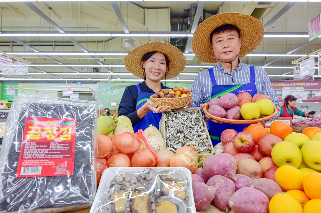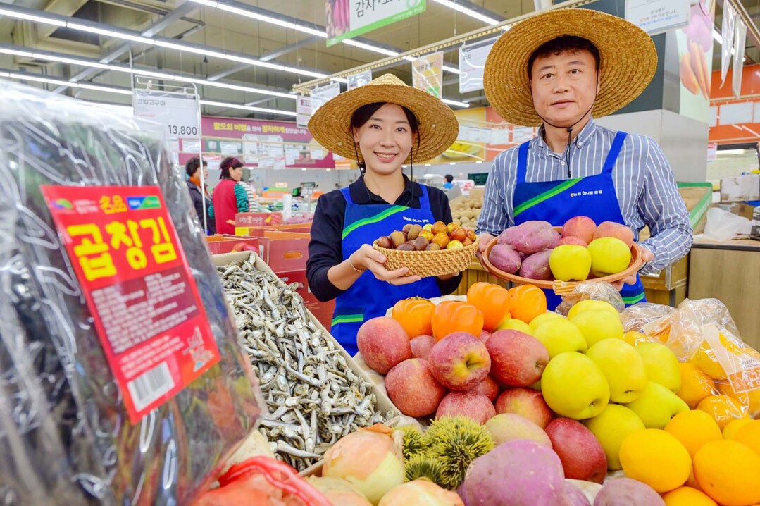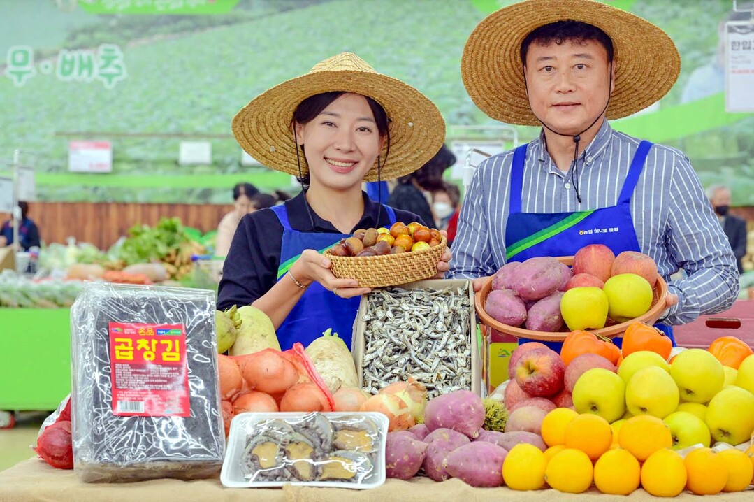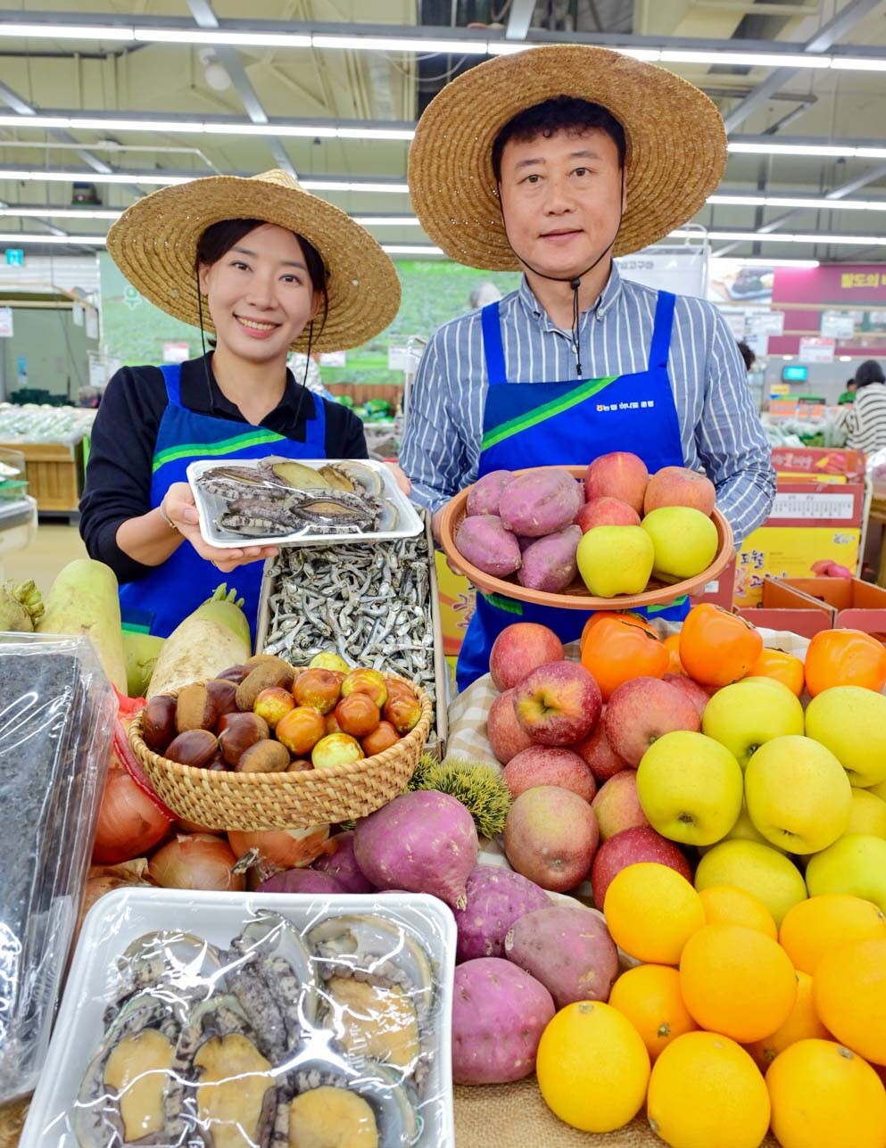 5일 서울 서초구 하나로마트 양재점에 모델들이 Harvest 페스타를 소개하고 있다. 양재·창동·청주·부산점 등 농협유통 하나로마트는 11월 6일부터 12일까지 전국 8도에서 엄선한 지역 대표 상품을 할인 판매한다. 농협유통 제공
