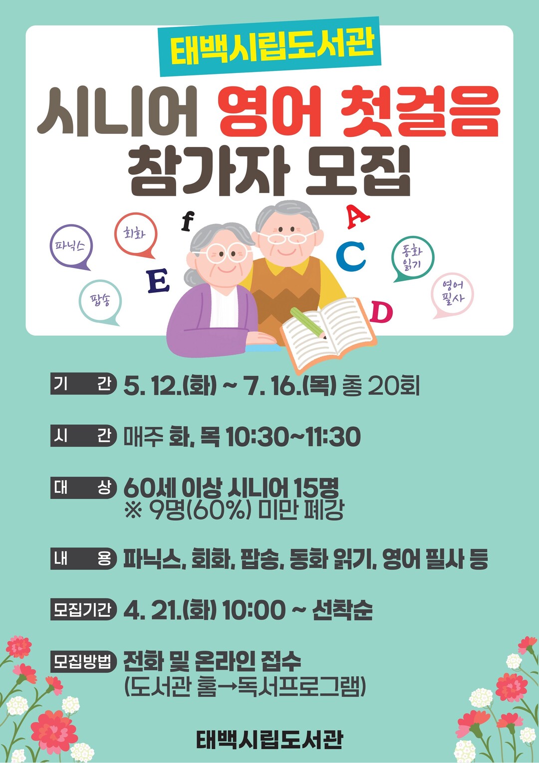 [로컬세계 = 박상진 기자]강원 태백시는 영어가 두려운 60세 이상 시니어를 대상으로 파닉스부터 시작하는 쉽고 재미있는 ‘시니어 영어 첫걸음’ 프로그램을 운영한다고 밝혔다.
