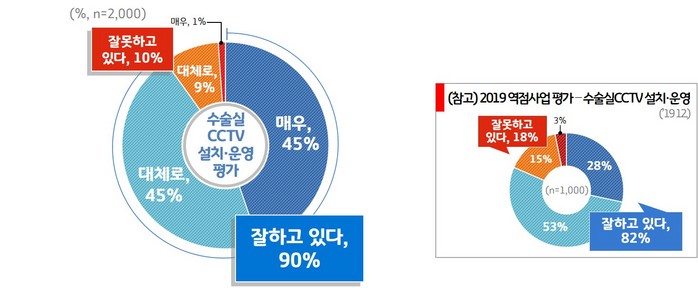 경기도 수술실 CCTV 설치·운영에 대해서는 도민의 90%가 ‘잘하고 있다’는 긍정 평가를 해 지난해 12월에 실시한 조사보다 8%p 높은 수치를 보였다.
