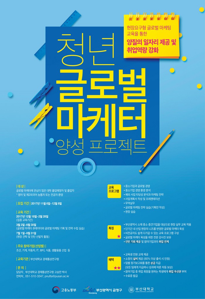 교육대상은 부산시 거주 대학 졸업예정자 및 졸업자이며 접수기간은 오는 30일부터 12월 15일까지이고 자세한 사항은 부산대학교 국제통상연구원(051-510-3347)으로 문의하면 된다.