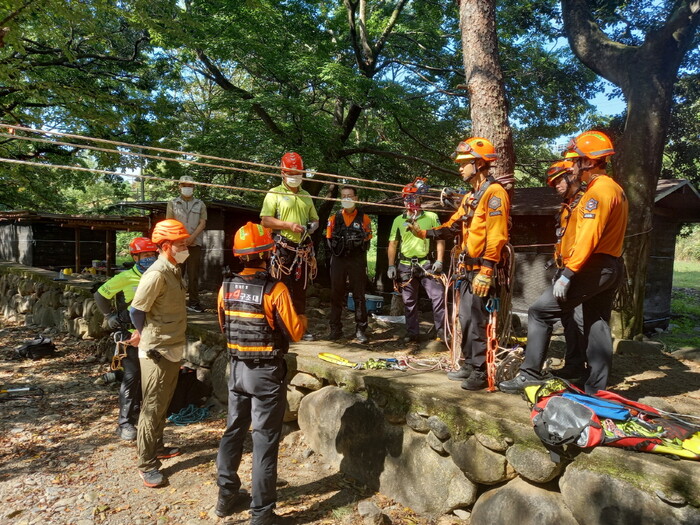 ▲ 지리산국립공원전남사무소와 순천소방서 119산악구조대 계곡 구조 기술 교류.(2022. 9. 16. 화엄사계곡)/ 국립공원공단 제공 |
