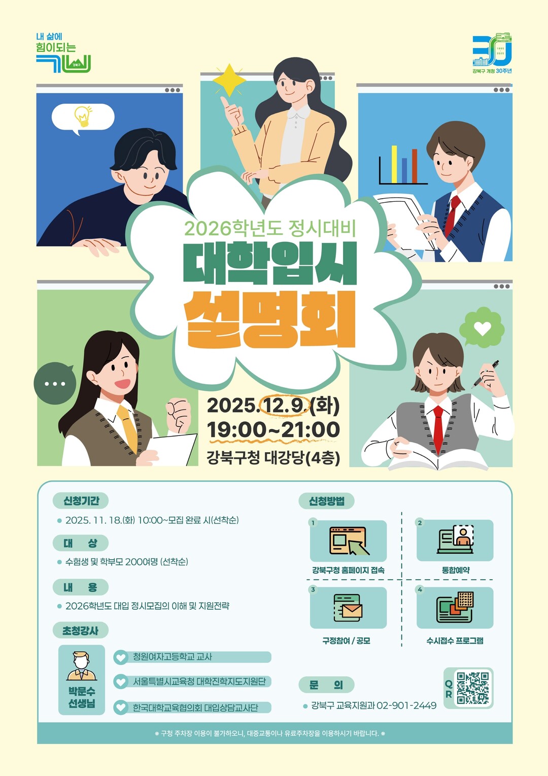 [로컬세계 = 임종환 기자]서울 강북구는 오는 12월 9일과 13일 강북구청 대강당에서 ‘2026학년도 정시 대비 대학입시 설명회’와 ‘1:1 진로진학 상담’을 연이어 진행한다고 12일 밝혔다.