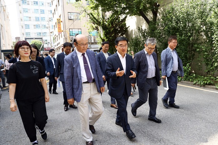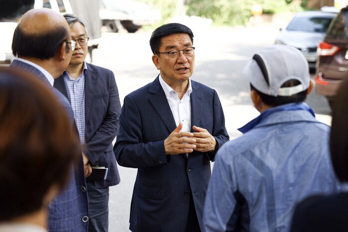 ▲ 문헌일 구로구청장이 3일 구로2동 보광아파트를 방문해 현장을 둘러보고 있다. 구로구 제공 |