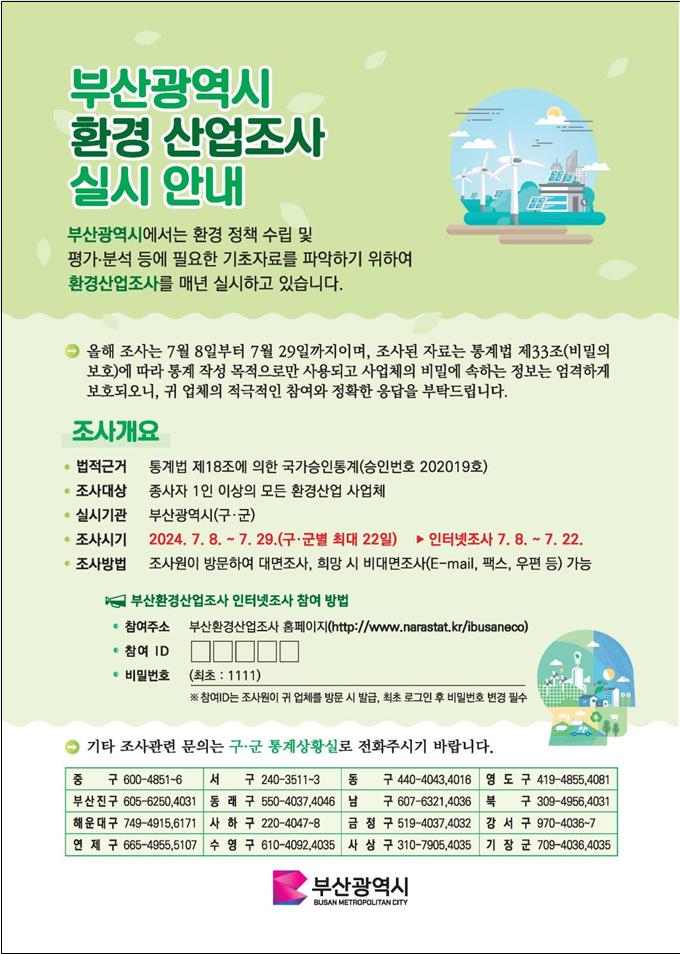 조사 대상은 2023년 12월 31일 기준으로 부산시 소재에서 환경산업 활동을 수행하고 있거나 수행했던 종사자 1인 이상의 모든 사업체로, 8천여 개 사업체가 해당한다.