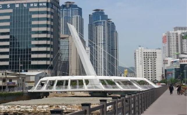 이에 시는 총 사업비 39억원을 들여 동천 내 문현금융단지 앞에서 부산상공회의소 간 길이 41.7m, 폭 6~12m의 주탑형사장교인 ‘동천 명품보행전용교량’을 조성한 것이다.