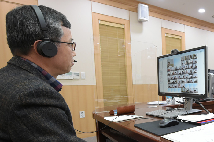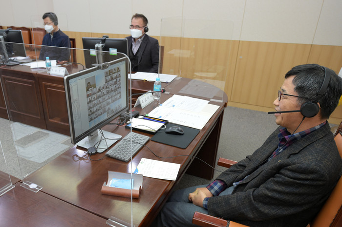 | ▲20일 정연태 대표이사가 하나로마트 점장들과 화상회의를 하고 있다. |