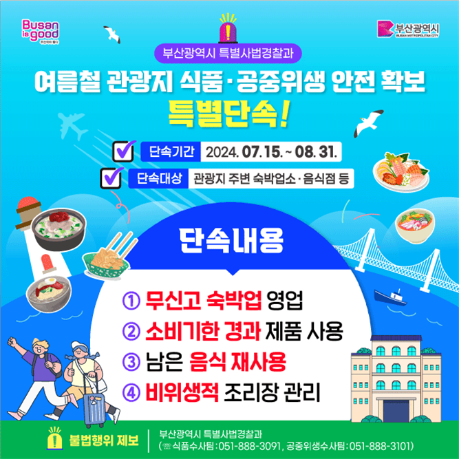 [로컬세계 부산=전상후 기자] 부산시특별사법경찰과(이하 특사경)는 여름 휴가철을 맞아 오는 15일부터 8월 31일까지 관광지 주변 숙박업소, 맛집 등의 불법영업 행위를 특별 단속한다고 11일 밝혔다.
