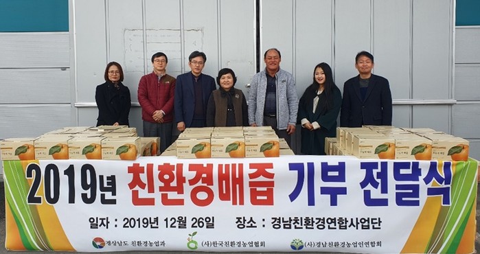 | ▲한국친환경농업협회와 친환경농산물자조금은 26일, 전국 복지시설에 무농약 배와 도라지를 활용해 가공한 '친환경 배즙' 증정식을 가졌다.(친환경농산물자조금 제공) |
