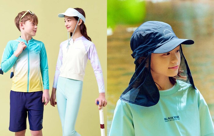 ▲ 블랙야크 키즈 이미지_왼쪽 래쉬가드, 오른쪽 BK안티벅차양분리캡. 블랙야크 제공 |
