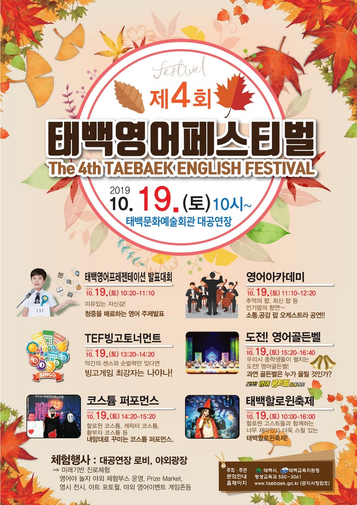 한편 행사 참가자에게는 다양한 기념품과 선물이 지급되며, 특히 ‘도전! 영어골든벨’ 최후의 1인에게는 태백교육장상과 화상영어 1년 무료 수강권이 주어질 예정이다.