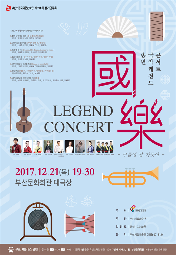문화회관 관계자는 “부산시립국악관현악단의 우리의 전통과 서양 음악이 하나로 어우러진 ‘송년 국악 레전드 콘서트’를 통해 한 해 동안의 아쉬움을 달래고 다가올 2018년을 희망차게 맞이하시길 바란다”고 말했다.