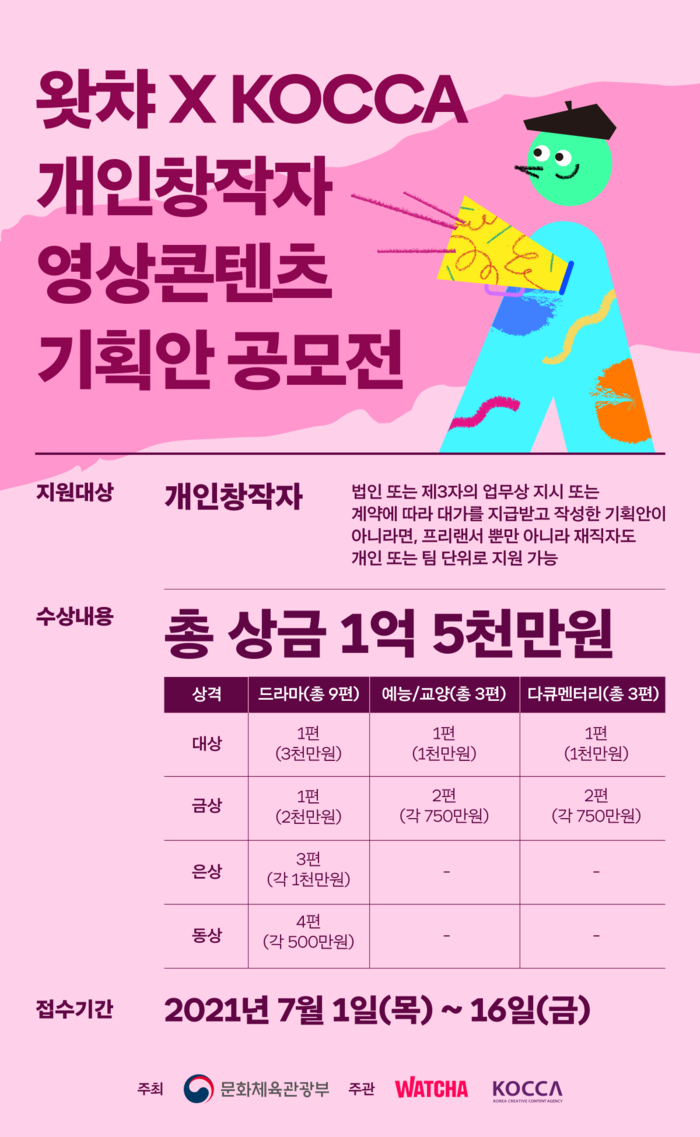 문화체육관광부와 한국콘텐츠진흥원은 국내 OTT 플랫폼 왓챠와 독창적인 기획안을 발굴하고자 창작자 대상 공모전을 개최하며, 선정된 우수작은 왓챠 오리지널 콘텐츠로 제작해 연계지원한다.