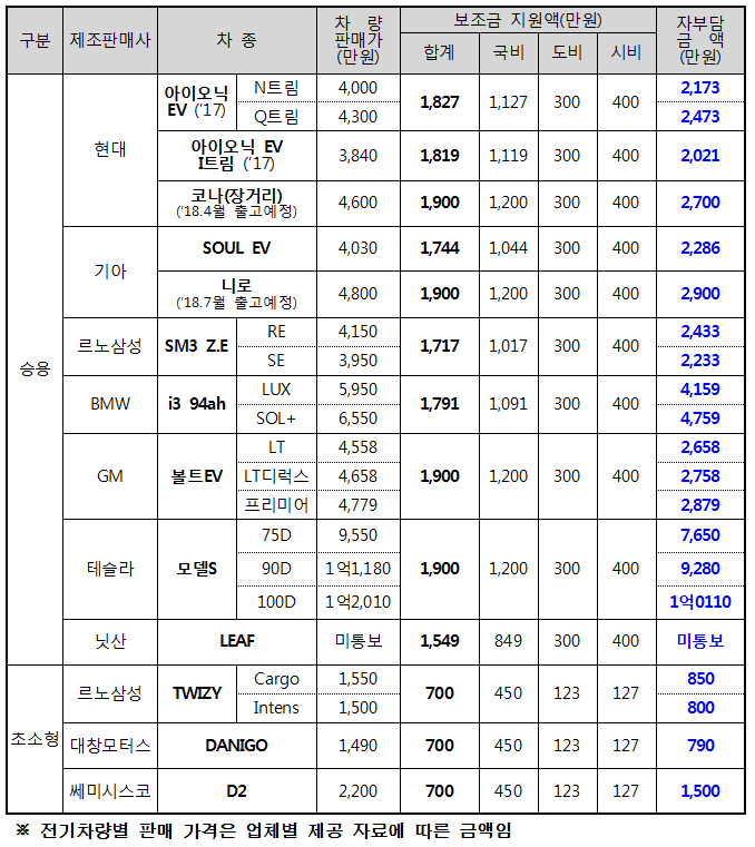개인은 1대로 제한하나 법인 및 기업체는 제한이 없으며, 전기차 보조금은 전기차 성능을 고려한 국고보조금 차등지원으로 인해 승용전기차는 대당 1,549만원에서 1,900만원 범위에서 차종별로 차등 지원되고 초소형 전기차는 차종 구분 없이 대당 700만원을 지원받을 수 있다.