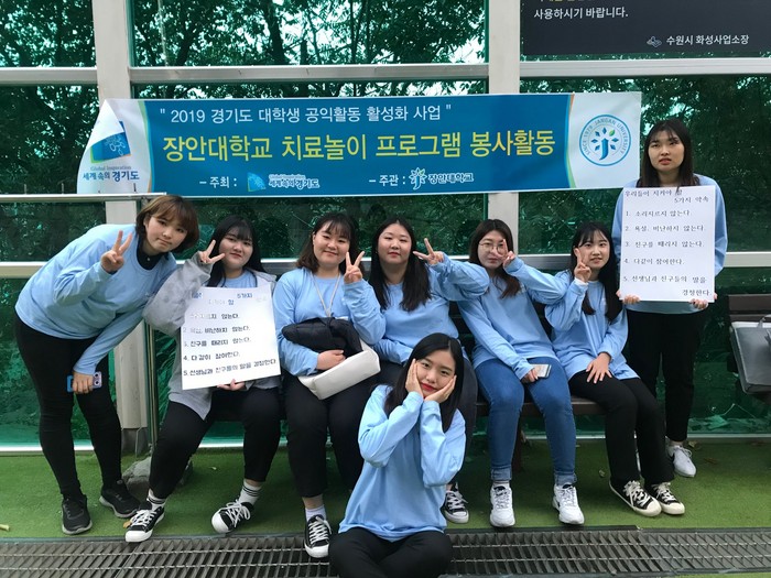 | ▲장안대학교-5대핵심가치-복지, 집단 및 개별 프로그램(치료놀이, 놀이치료) 프로그램 강사양성 교육, 사회복지기관 대학생 자원봉사활동. |