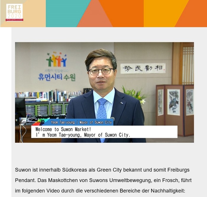 | ▲독일 프라이부르크 홈페이지에 열린 ‘가상자매도시 마켓’에 게시된 염태영 수원시장의 축하 메시지 영상과 수원이 한국 내 그린시티라고 설명하는 소개글 캡쳐. |
