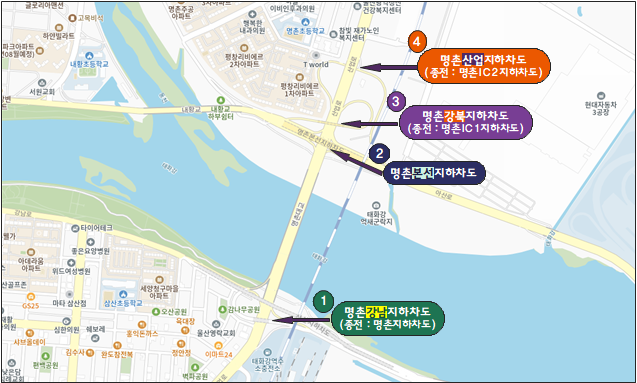 [로컬세계 = 박종순 기자]울산시는 위치 혼선 우려가 컸던 명촌교 일대 산업로와 강남·강북로 4개 지하차도의 명칭을 정비했다고 28일 밝혔다.