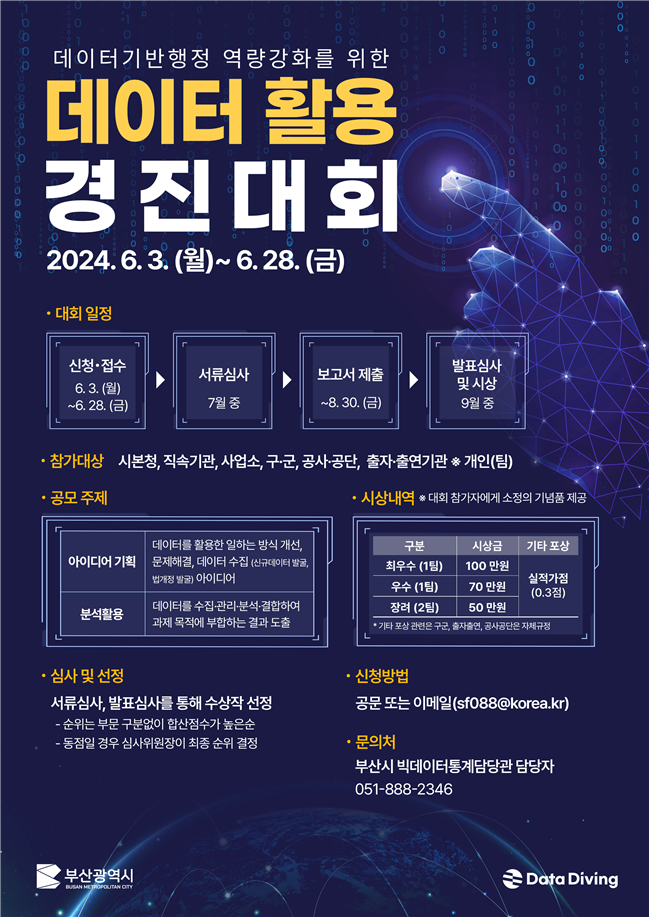 [로컬세계 부산=맹화찬 기자]부산시는 공무원과 공공기관 직원들의 데이터기반행정 역량 강화와 데이터를 활용한 일하는 방식 개선을 위해 '2024년 부산시 데이터 활용 경진대회(이하 경진대회)'를 실시한다고 밝혔다.
