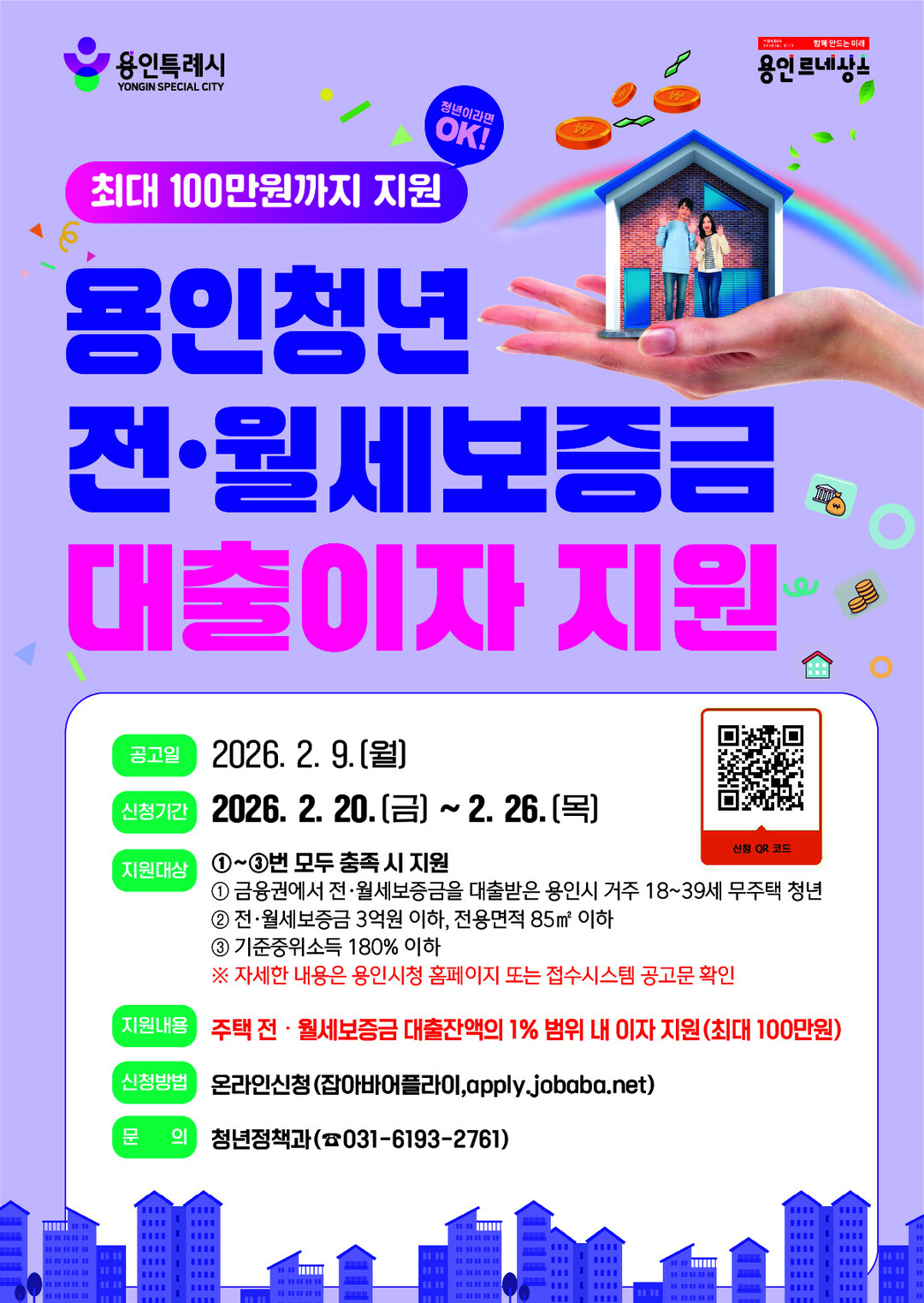 경기 용인특례시는 청년층을 대상으로 전월세 보증금 대출이자를 지원한다고 6일 밝혔다. 대상은 전월세 보증금 대출을 이용 중인 18~39세 무주택 청년으로, 대출잔액의 1% 범위 내에서 최대 100만 원까지 지원받을 수 있다.