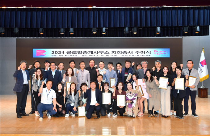 ▲부산시는 '2024년 글로벌중개사무소 ' 를 확대 선발했다. 수여식 후 기념촬영을 하는 장면. 부산시 제공 |