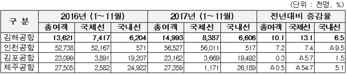 김해공항은 ’14년부터 국제선 여객이 국내선을 넘어서며, 국제선 중심으로 공항기능이 전환된 이후로 현재 인천공항 다음으로 국제선 여객처리실적이 많은 국내 제2의 관문공항으로서 국제선 여객증가세가 전체 여객 증가를 견인하고 있다. 특히 금년에는 중국의 금한령 조치로 타 공항의 여객증가세가 주춤한 상황에서도 주요공항 중 유일하게 10% 이상의 여객증가세를 기록하며 고공행진 중이다.