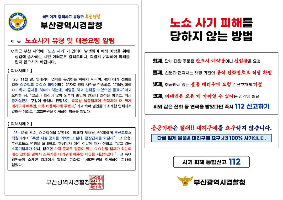 [로컬세계 = 맹화찬 기자] 부산경찰청에서는 최근 다양한 형태로 진화하는 노쇼사기 피해가 지속적으로 발생(’25년 11월말 기준 326건) 하고 있어, 연말연시를 맞아 상업에 종사하는 시민들의 노쇼사기 피해 예방을 위해 집중 홍보를 추진한다.