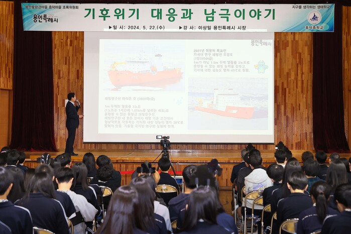 ▲ 이상일 용인특례시장이 지난 22일 기흥구 영덕동 흥덕중학교에서 ‘기후 위기 대응과 남극 이야기’를 주제로 환경 특강을 했다. 용인시 제공 |