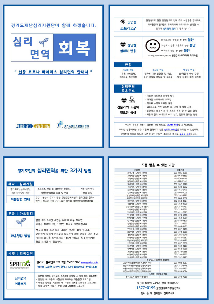 또 ‘경기도 심리면역 안내서’에는 감염병에 대한 심리적 반응, 전문가의 도움이 필요한 증상, 심리면역을 위한 방법과 함께 도움받을 수 있는 기관의 연락처 등이 소개돼 있다.