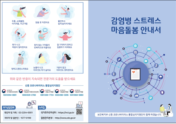 ‘감염병 스트레스 마음돌봄 안내서’에서는 ▲믿을 만한 정보에 집중 ▲힘들다면 정신건강전문가의 도움을 받을 것 ▲자신의 몸과 마음을 돌볼 것 등의 대처법과 함께 격리자를 위한 정신건강 대처법을 안내하고 있다.