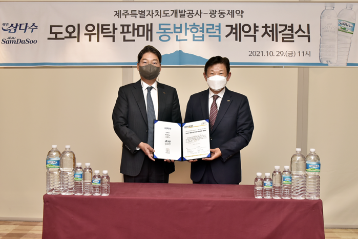 광동제약은 지난 9월 제주개발공사가 공고한 'JPDC 제품 제주도외 위탁판매 동반협력사 공개모집'에 참여해 제주삼다수 영업·마케팅 전략과 제주도 발전 기여 방안 등에서 높은 평가를 받아 우선협상자로 선정됐고, 이날 정식 계약을 체결했다.
