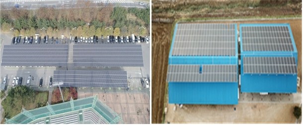 | ▲왼쪽부터 안양석수체육공원주차장 태양광시설, 여주강천게이트볼장 태양광시설.(경기도 제공) |