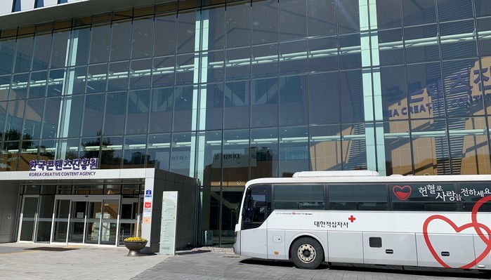 ▲지난 4일 ‘생명나눔, 사랑의 헌혈운동’이 진행되는 한국콘텐츠진흥원 나주본원 앞 전경.(콘진원 제공) |