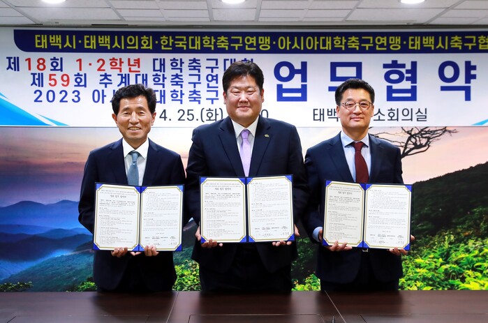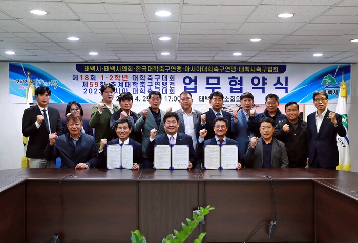 [로컬세계=박상진 기자]강원 태백시와 한국·아시아대학축구연맹은 지난 25일 시청 소회의실에서 제18회 1,2학년 대학축구대회, 제59회 추계대학축구연맹전 및 2023 아시아대학축구대회 개최를 위한 업무협약을 체결했다.
