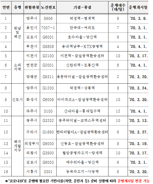 이어 3월 9일 양주시(8906번), 3월 13일 광주시(G3202번), 3월 17일 의왕시(G3900번), 이천시(G2100번), 3월 19일 의정부시(G6000번), 3월 20일 양평군(G9311번), 3월 24일 양주시(G1200번), 3월 27일 구리시(G1690번) 순으로 총 8개 노선의 운행이 시작된다.