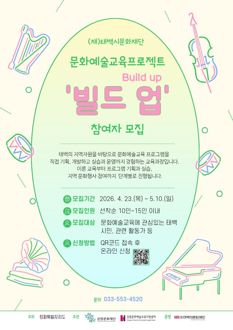 [로컬세계 = 박상진 기자] 강원 태백시문화재단은 지역 문화예술교육 인력 양성과 지속 가능한 문화예술 생태계 조성을 위해 '2026 태백 문화예술교육 프로젝트 ‘빌드 업(Build up)’' 참여자를 모집한다고 28일 밝혔다.