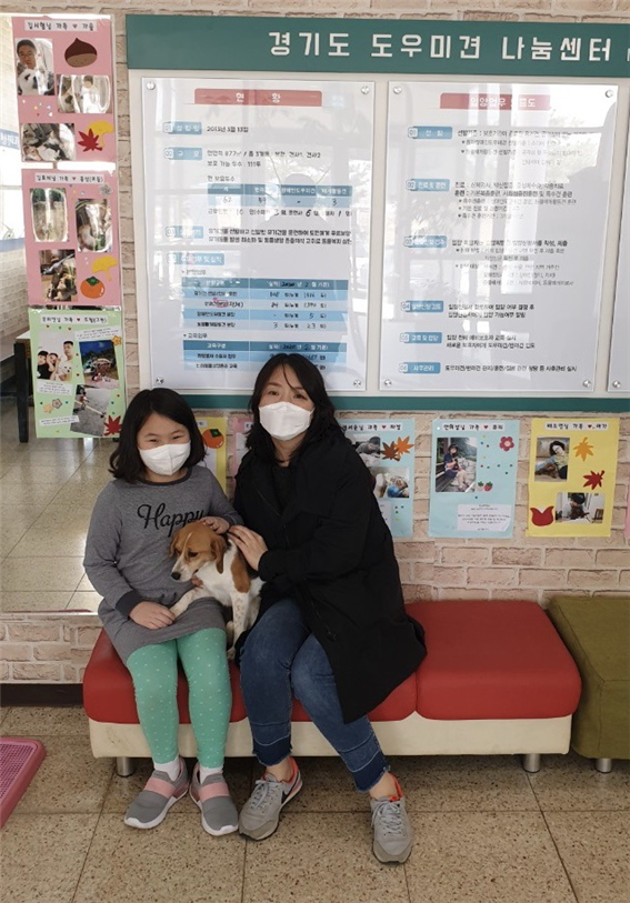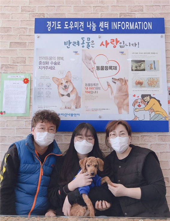| ▲도우미견나눔센터를 통한 입양된 짱이와 가족들.(경기도 제공) |