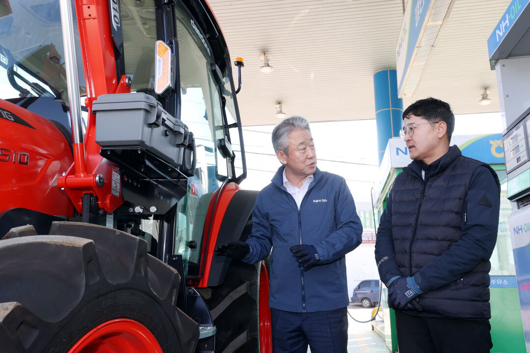 강호동 농협중앙회장이 7일 동춘천농협에서 운영하는 농협주유소를 방문하여 트랙터에 농기계용 면세유를 직접 주유하고 있다. 농협 제공