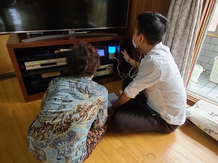 ▲돌봄 대상 어르신에게 인공지능 스피커 사용법을 설명하고 있다. 관악구 제공 |
