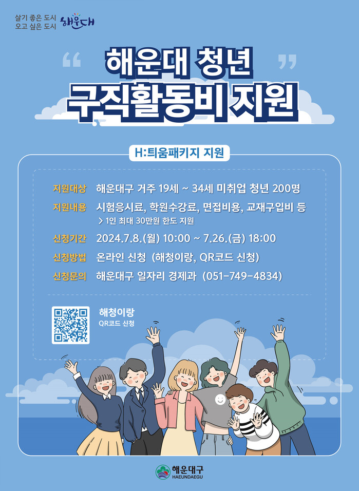 [로컬세계 부산=맹화찬 기자]부산 해운대구는 청년 구직활동비(취업 합격 H:틔움패키지) 지원사업 대상자를 모집한다고 5일 밝혔다.