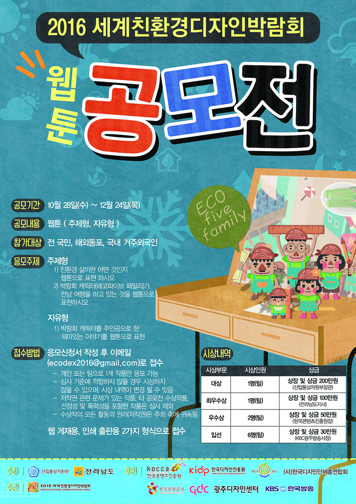 2016세계친환경디자인박람회 조직위원회에 따르면 오는 24일까지 두 달간 친환경디자인박람회 공식 마스코트인 ‘에코파이브 패밀리’와 함께 하는 전남여행을 주제로 웹툰 공모전을 진행하고 있다.