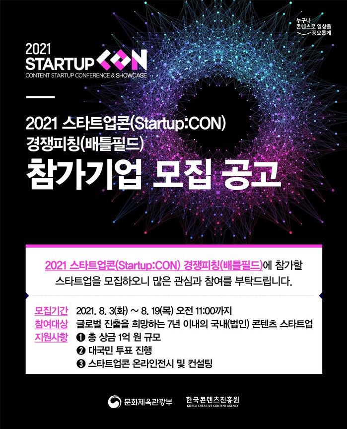 문화체육관광부와 한국콘텐츠진흥원은 ‘2021 스타트업콘 (STARTUP:CON, 이하 스타트업콘)’에서 국내 우수 콘텐츠 스타트업의 글로벌 진출을 지원하기 위한 ‘경쟁피칭(배틀필드)’에 참가할 스타트업을 오는 19일까지 모집한다.