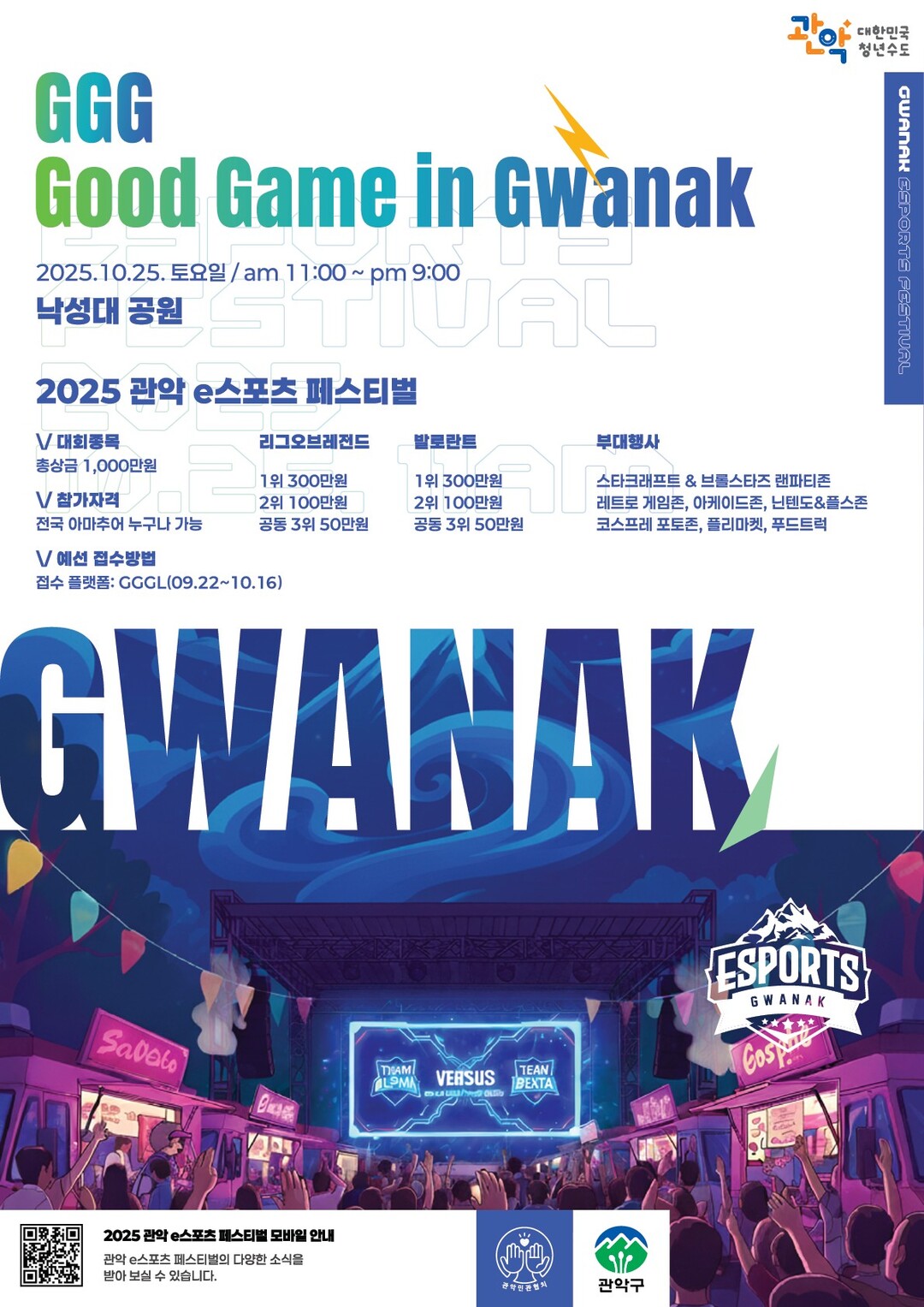또한 본선 당일에는 사전 신청 없이 누구나 참여 가능한 ‘랜 파티존’(브롤스타즈·스타크래프트)이 운영되며, ‘관악 Play Zone’에서는 ▲닌텐도 스위치 ▲플레이스테이션 ▲추억의 오락실 게임 등 온 가족이 함께 즐길 수 있는 다양한 콘텐츠가 마련된다.