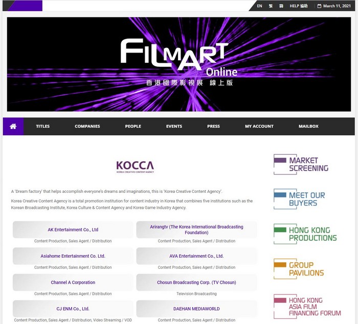 올해 3월 온라인으로 개최된 홍콩 필마트(FILMART)에는 콘진원이 마련한 온라인 한국공동관에 역대 최대 규모인 28개 기업이 참가해 대만, 싱가포르, 말레이시아 등 해외 방송사, OTT플랫폼과 계약을 체결, 전년 대비 25% 상승한 약 900만 달러 수출 실적을 달성했다.