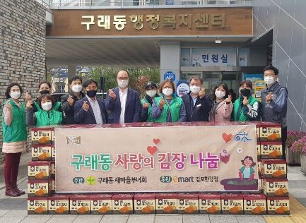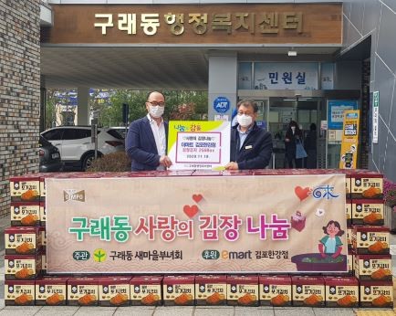 [로컬세계 김병민 기자]지난 18일 이마트 김포한강점(점장 박태현)은 구래동 새마을부녀회(회장 조경숙)를 통해 포기김치 256박스(500만원 상당)를 구래동행정복지센터에 통 크게 기탁했다.