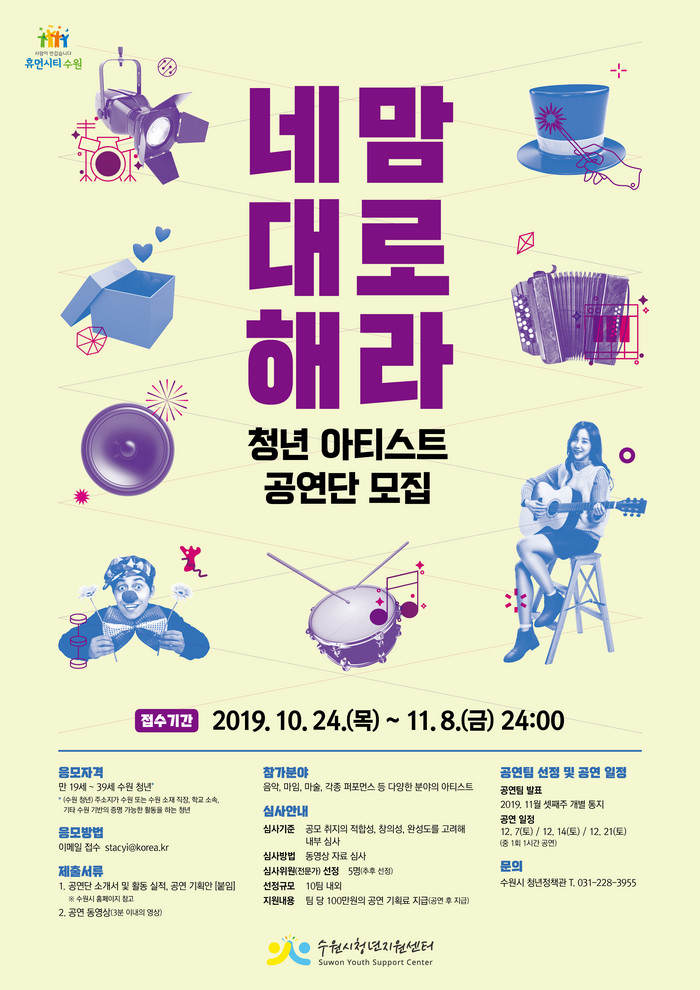 [로컬세계 고용주 기자]경기 수원시가 ‘수원청년주간’(12월 7~21일)에 열리는 공연 ‘네 맘대로 해라’에서 공연할 청년 아티스트 공연단을 11월 8일까지 모집한다.