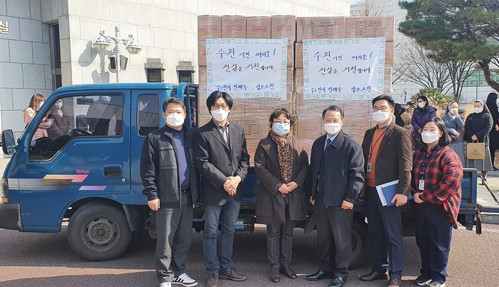 경기 수원시 관내 기업·단체 등이 “취약계층에게 전달해 달라”며 수원시에 마스크·손 소독제 등을 잇달아 기부하고 있다.