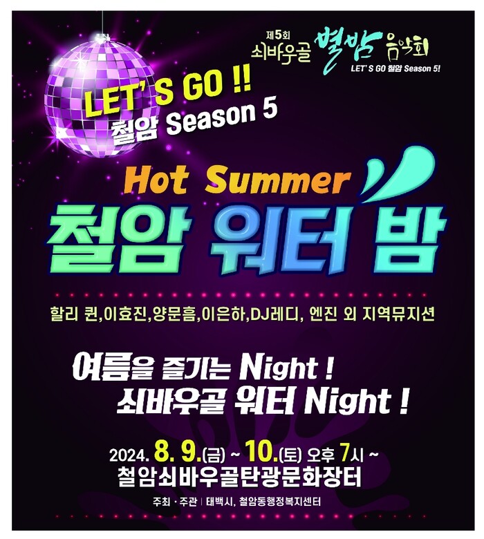제5회 철암 쇠바우골 별밤 음악회는 ‘레츠고 철암 시즌5’를 주제로 개최되며, 2000년대의 추억을 상기시키는 인기가수의 공연 및 신나는 디제잉으로 다양하고 흥겨운 즐길 거리와 관람객들의 참여 프로그램을 제공할 예정이다.