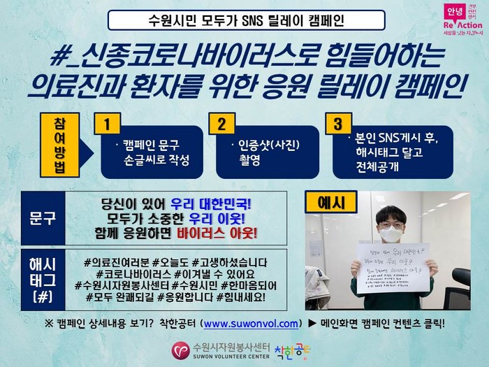 우리 사회 전체가 감염병 공포에 머물지 말고 힘을 모아 감염병 사태를 극복하자는 의지가 담긴 이 캠페인은 수원시자원봉사센터에서 시작됐다.