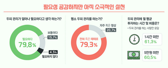 실천 의지는 비교적 약했다. 주기적으로 두피 관리를 실천하는지 묻는 질문에 부정 의견(79.3%)이 긍정 의견(20.7%)의 약 3.8배를 기록했다. 따로 관리를 하지 않는 이유로는 증상이 심하지 않다고 여긴다는 답변이 38.8%에 달했으며, 정보 부족(33.8%), 비용 부담(31.7%)이 다음으로 꼽혔다.